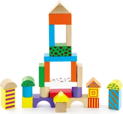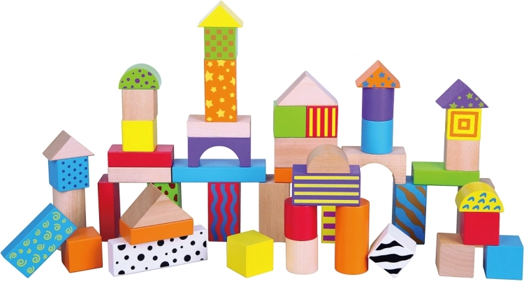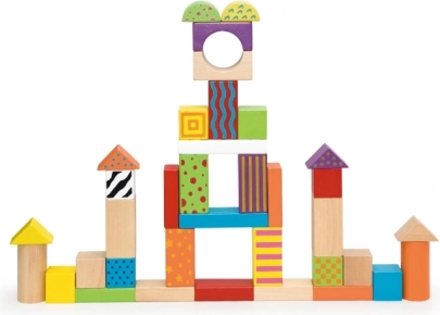 Pestre oblike – kocke, valji, loki in strehe – spodbujajo domišljijo ter podpirajo fino motoriko in prostorsko predstavljivost.