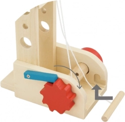 Otroci lahko z enostavnim vrtenjem navijalnega koleščka dvigujejo in spuščajo tovor. Mehanizem spodbuja koordinacijo oko–roka in omogoča gladko, varno delovanje.