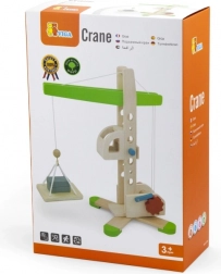 Ta leseni žerjav z vitlom otrokom prinaša realističen gradbeniško-igrivi doživljaj. Vrtljiva roka, ročno navijanje in škripčni sistem omogočajo varno dviganje in premikanje manjših predmetov. Naraven les, gladki robovi in zeleni detajli poudarjajo brezčasen dizajn in vzdržljivost igrače.