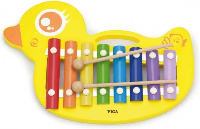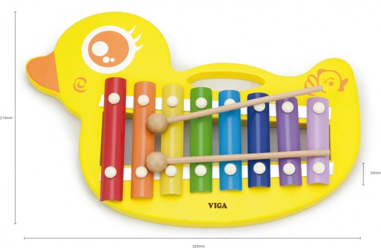 Ta prikupen otroški ksilofon v obliki račke navduši z živimi barvami in ergonomično obliko z ročajem za preprosto prenašanje. Kovinske barvne tipke ustvarjajo jasne tone, ki otroke spodbujajo k odkrivanju ritma in prvih melodij.