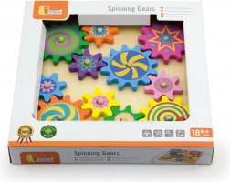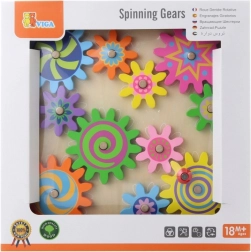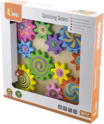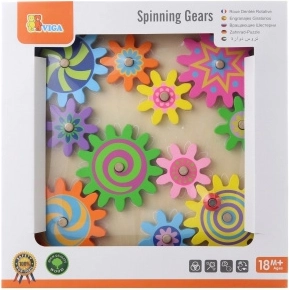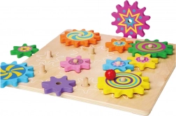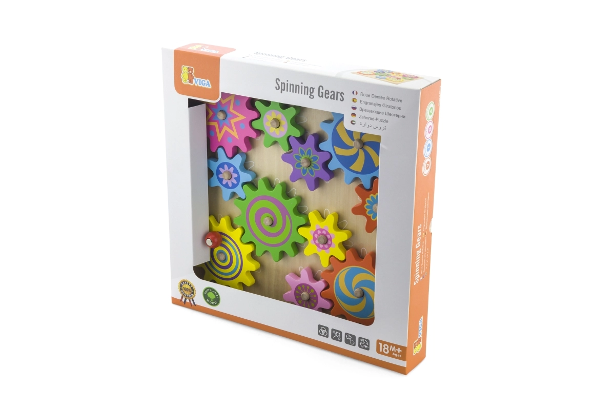 Ta pisani komplet lesenih zobniških kolesc na stabilni plošči bo razveselil male raziskovalce. Otroci nameščajo kolesca na zatiče, preizkušajo njihovo povezovanje in opazujejo, kako se po zasuku enega kolesc vsa gladko poženejo v gibanje. Igrača podpira koordinacijo oko–roka, logično razmišljanje in učenje vzroka in posledice.