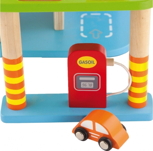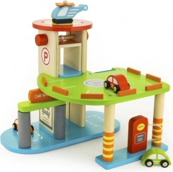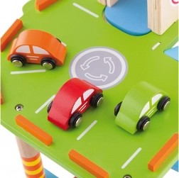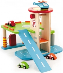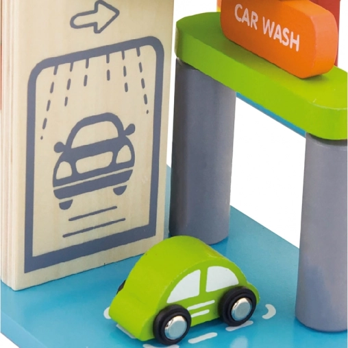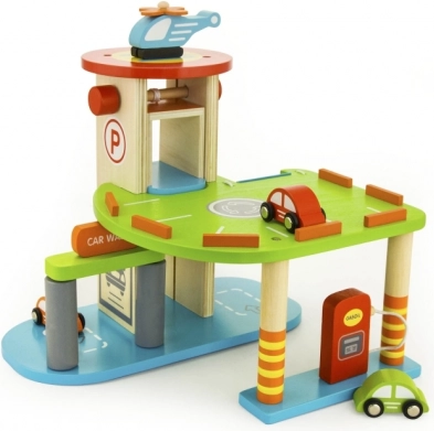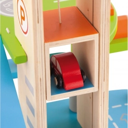 Ta kakovostna lesena garaža ponuja več nivojev parkiranja, pristajalno ploščad za helikopter ter praktično dvigalo za enostavno premikanje avtomobilčkov med nadstropji. Zahvaljujoč premišljeni zasnovi s stezami, oznakami in dodatki si otroci urijo koordinacijo gibov in razvijajo svojo domišljijo.