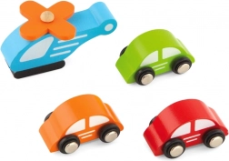Del pakiranja so 3 leseni avtomobilčki in helikopter, zato lahko začnete z igro takoj po odprtju. Varne zaobljene oblike in trpežni materiali so idealni za vsakodnevno igranje.