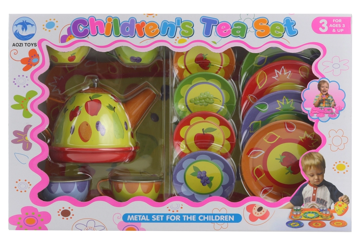 Čajni set vsebuje: 1x čajnik približno 11 cm, 4x skodelica s krožničkom, 4x krožniček in 1x pladenj. Dimenzije pakiranja približno 32 × 20 × 9,5 cm. Starost 3+