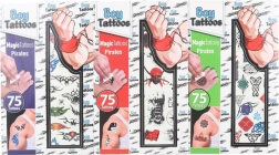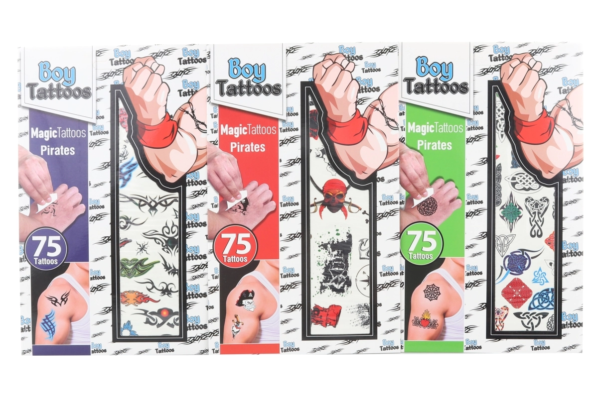 Zabavajte male pustolovce s kompletom začasnih tetovaž, ustvarjenim posebej za fante. Pakiranje ponuja 75 različnih motivov, enostavno nanašanje in varno uporabo od 3. leta – idealno za rojstnodnevne zabave, nagrade in vsakodnevno igro.