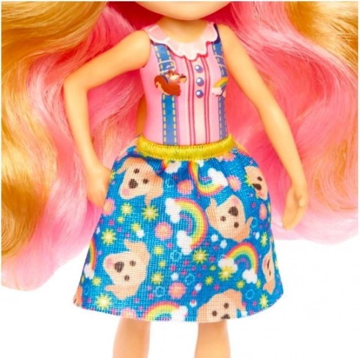 - Rožnato-blond lasje, modro krilo z motivi kužkov in mavrice, rožnati čevlji