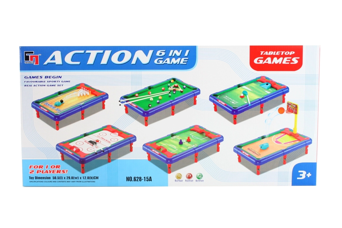 Uživajte v neskončni zabavi s tem vsestranskim kompletom namiznih iger 6v1, ki združuje priljubljene športe v enem kompaktnem setu. Na eni mizi lahko igrate bowling, košarko, hokej na ledu, biljard, golf in nogomet. Idealen za otroke od 3 let dalje, razvija motoriko, koordinacijo in tekmovalnost ter je odlična izbira za domačo zabavo.