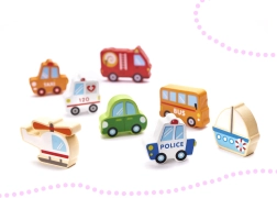 Podpira razvoj fine motorike, logičnega mišljenja in prepoznavanja barv. Z vključitvijo živali, kot so slon, žirafa, zebra, lev in krokodil, je zabava obogatena tudi z elementi živalskega vrta. Raznolikost prevoznih sredstev, kot so policija, gasilci, rešilci, taksi, avtobus, osebni avtomobil, kolo in čoln, zagotavlja, da otroku nikoli ne bo dolgčas.