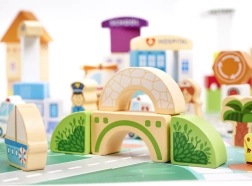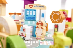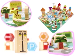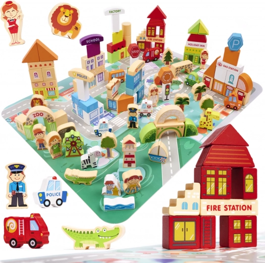 Poživite ustvarjalnost vašega otroka s tem izjemno barvitim lesenim gradbenim kompletom, ki vsebuje 120 kosov, idealnih za ustvarjanje mestnega okolja. Celoten komplet vključuje stavbe, kot so bolnišnica, tovarna, hotel, bencinska črpalka in gasilska postaja, kar otrokom omogoča raziskovanje in razvijanje njihove domišljije.