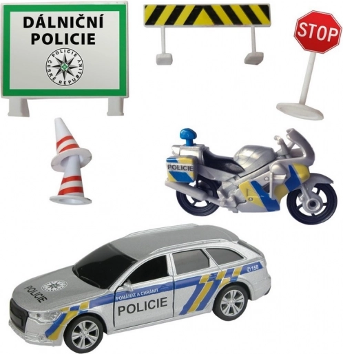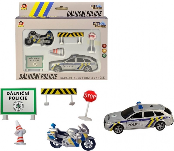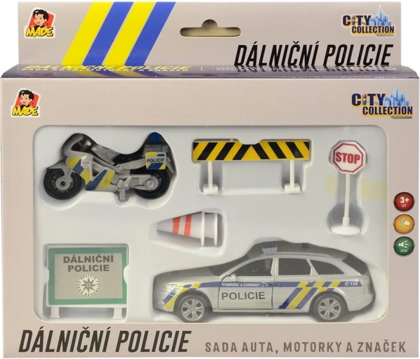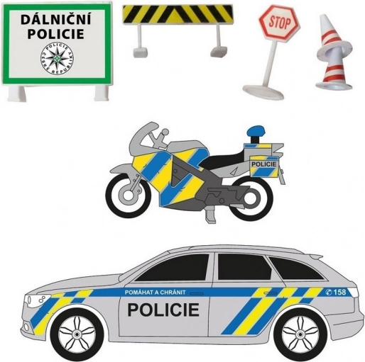 Ta komplet prinaša avtentično izkušnjo dela avtocestne policije, kot jo poznamo z naših cest. Kovinski policijski avto z svetlobnimi in zvočnimi efekti ter plastični motor skupaj s prometnimi znaki spodbujajo ustvarjalno igro in razvoj domišljije. Zaradi pogona na navijanje nazaj se vozila hitro zaženejo in zabava se lahko začne.