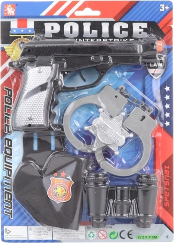 V pakiranju najdete pištolo dolžine približno 19,5 cm s tokom, plastične lisice za realistično igro, praktičen daljnogled za opazovanje in stilsko značko za popolno policijsko vlogo. Komplet je zasnovan za otroke od 3 let in je odlično darilo za male ljubitelje akcijskih iger.