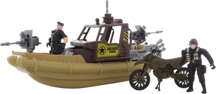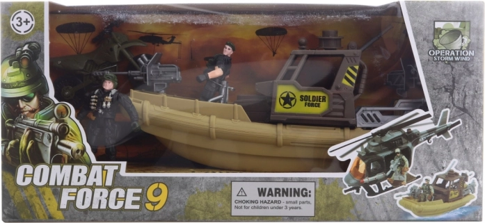 Vojaški set s čolnom, motorjem in 2 vojaka. Odlična igra za otroke od 3. leta, spodbuja domišljijo in ustvarjalno igro. Mere embalaže 45,5×20,5×12 cm.
