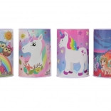 - Čaroben dizajn z motivom samorogov, ki otroke zabava in motivira k varčevanju.