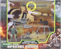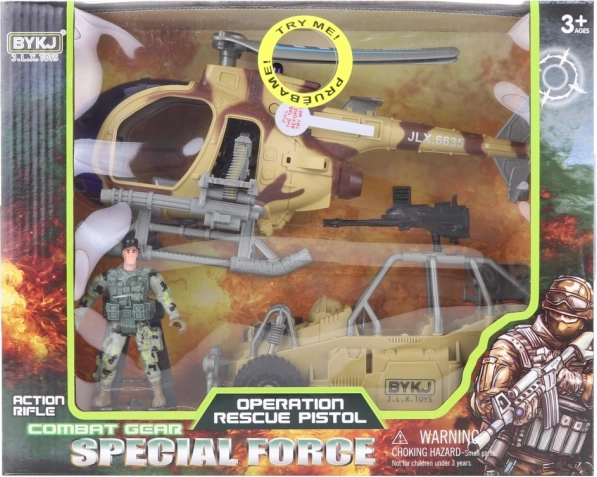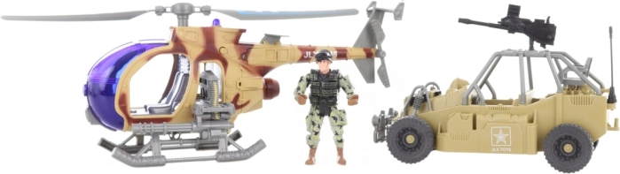 Ta realistični vojaški komplet otrokom ponuja veliko zabave in prostora za domišljijo. Helikopter ob pritisku na gumb sveti in oddaja zvoke, kar še okrepi doživetje igre. Del kompleta sta tudi oklepni avto in figurica vojaka za popolne akcijske scenarije.