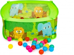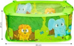 Ograjen prostor z dnom in 50 žogicami – ni za vodo, približne dimenzije 75 cm × 75 cm × 30 cm. V paketu je 50 žogic. Bazen lahko uporabite doma v otroški sobi ali poleti zunaj na vrtu. Otroci se bodo ob igri zelo zabavali. Starost 6m+