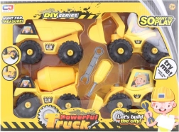 V paketu najdete nakladalnik, bager, mešalnik in prekucnik. Vrteča se kolesa in podrobna izdelava spodbujata realistično igro na gradbišču.