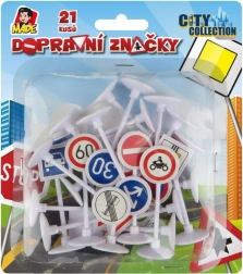 Zabaven komplet prometnih znakov za male voznike od 3 let. Pakiranje vsebuje 21 plastičnih znakov iz kolekcije City Collection, ki ne potrebujejo baterij in so odlični za razvoj domišljije in spretnosti. Kompaktne mere 18 × 16 × 3 cm olajšajo prenašanje in shranjevanje.