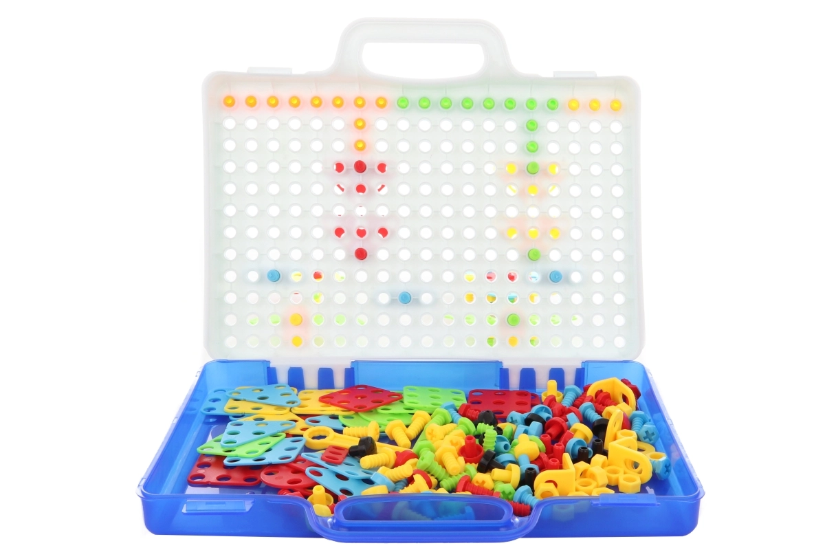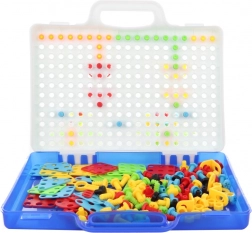 Vse je shranjeno v prenosnem kovčku s pokrovom, ki služi kot pegboard, zato je sestavljanko preprosto prenašati in pospraviti. Odlična pomoč pri razvoju motorike, koordinacije oko–roka, kreativnosti in potrpežljivosti.