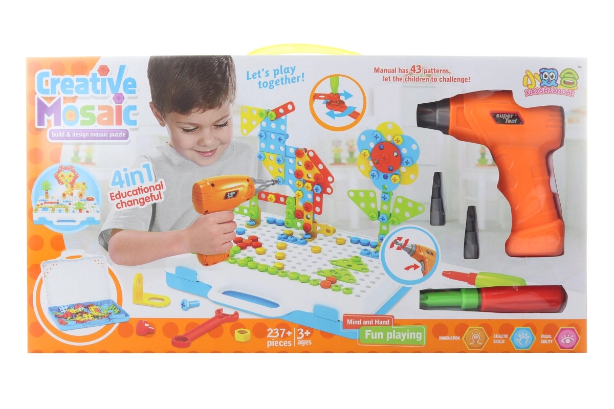 Ta vijačna sestavljanka je idealna za male graditelje, ki imajo radi ustvarjanje in sestavljanje. Deli različnih oblik in barv se s pomočjo plastičnih vijakov preprosto pritrdijo na ploščo z luknjami, bodisi ročno z izvijačem ali z otroškim akumulatorskim vrtalnikom na 2× AA bateriji (nista priloženi).