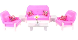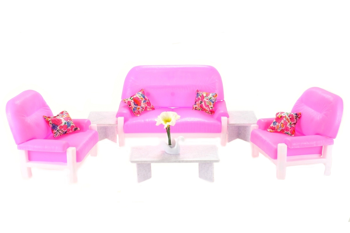 Glorie Dnevna soba vsebuje plastičen kavč za punčke z merami približno 22 cm × 11 cm × 13 cm, 2 plastična naslanjača z merami približno 13,5 cm × 11 cm × 13 cm, plastično mizico približno 7,5 cm × 15 cm × 5 cm z dodatkom na mizi – plastičnim labodom s cvetovi, 2 plastična tabureja približno 7,5 cm × 4 cm. Kot dodatki so priložene 4 blazinice. Punčka in fantka nista vključena v paket. Starost 3+