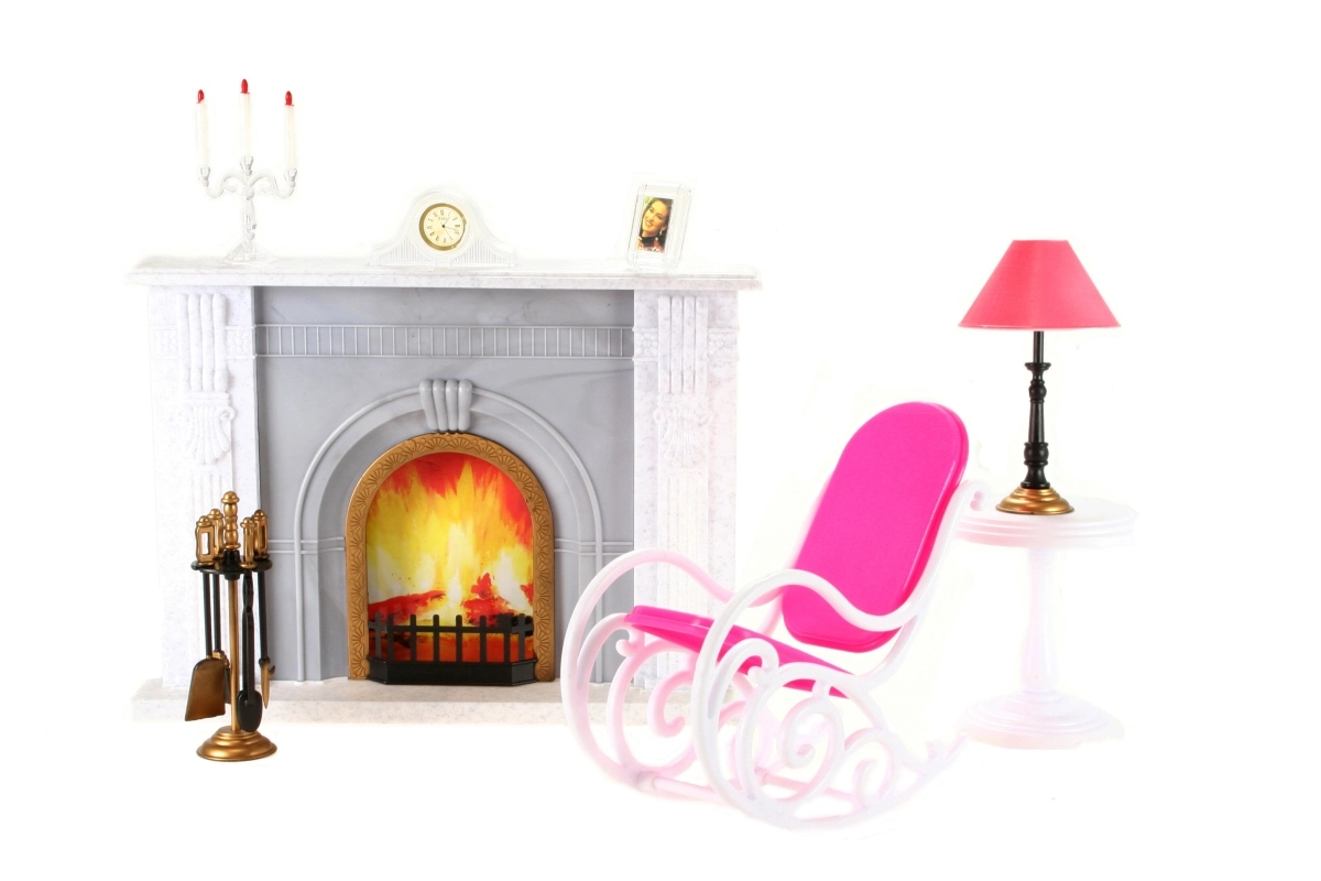 Stilski komplet za hiško za punčke prinaša prijetno vzdušje dnevne sobe. Vsebuje kamin z dekoracijami, gugalni stol, mizico z lučko in stojalo z orodjem za kamin. Odlično za kreativno igro in dopolnitev notranjosti punčkine hiške. Punčka ni vključena. Primerno za otroke od 3 let.