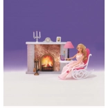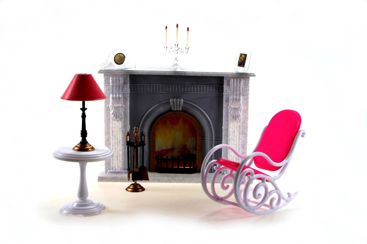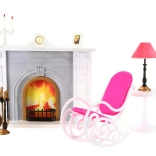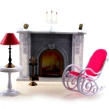 - Plastičen kamin, svečnik, slika, ura, gugalni stol, mizica z lučko, stojalo z orodjem za kamin
