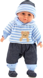 Dojenček z mehkim telesom. Dojenček je oblečen v barvni pižamici, ki jo je mogoče sleči (ježek). Dimenzije dojenčka približno 35 × 17 × 8 cm. Pakirano v plastični vrečki. Starost 3+