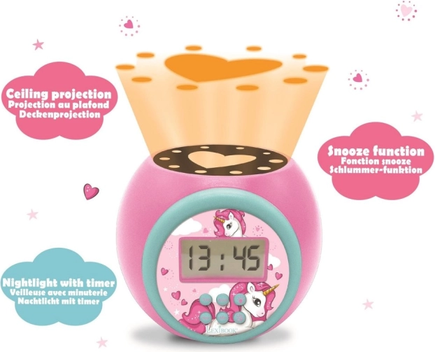 Ta otroška budilka s projektorjem je idealen dodatek za otroško sobo – projicira tematsko sliko samoroga na strop ali steno in hkrati nudi nežno nočno osvetlitev z gladkim prehajanjem barv. Ustvari pomirjujoče vzdušje, ki pomaga otrokom premagati strah pred temo in mirno zaspati.