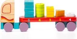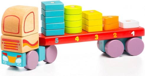 Lesena sestavljanka CUBIKA Tovornjak z geometrijskimi oblikami je več kot le igrača. Z 19 barvnimi deli se lahko otroci učijo razvrščati oblike in barve, kar razvija njihove senzomotorične sposobnosti. Vsak del je zasnovan tako, da se prilega drugim, bolj izkušeni graditelji pa lahko pravilnost števila zloženih delov preverijo po številkah na podvozju tovornjaka.