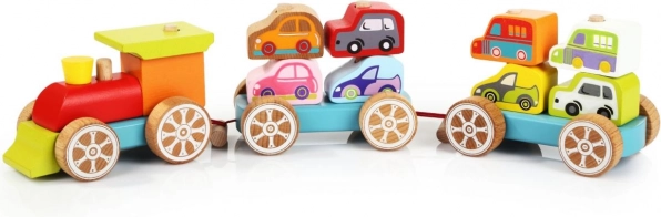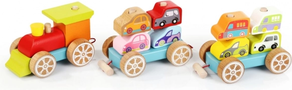 Ta barvna lesena sestavljanka vsebuje 14 delov, iz katerih lahko otroci sestavijo vlak z dvema vagonoma in osmimi avtomobilčki. Igrajo se ne le z posameznimi deli, temveč tudi razvijajo svoje senzomotorične sposobnosti, logično razmišljanje in kreativnost.