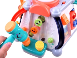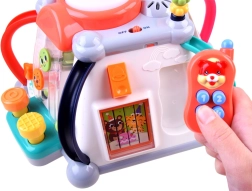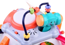 Volan s hupo in zvokom motorja, zobniki z melodijami in lučmi, izvlečni mikrofon z nastavitvijo glasnosti, stranica s kladivcem in tunelom za kroglico, telefon z gumbi in preklapljanjem slik, svetleči boben, labirinti s kroglicami