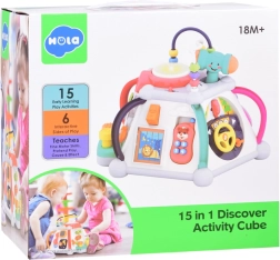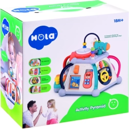 Večkocka HOLA prinaša bogat nabor aktivnosti za najmlajše. Vsaka stranica ponuja drugačen tip igre – od vožnje avtomobilčka, zobnikov s svetlobnimi učinki in melodijami, do mikrofona z osvetljenim »televizorjem«. Zgornja stran skriva labirinte s kroglicami, svetleči boben in prostor za shranjevanje kladivca. Vse je zasnovano za majhne otroške roke in varno raziskovanje.