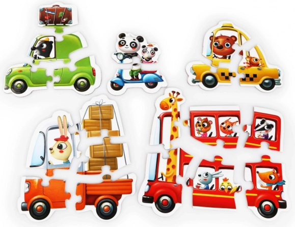 Sestavite pet barvitih vozil z živalmi. Vsaka slika ima 2–6 koščkov in podpira postopno učenje brez frustracij.