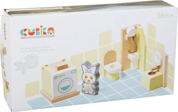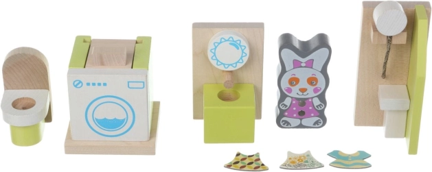 Leseni komplet pohištva za punčke »Kopalnica« je idealna izbira za razvoj senzomotoričnih sposobnosti in ustvarjalnosti otrok. Ta komplet z 8 deli vsebuje: