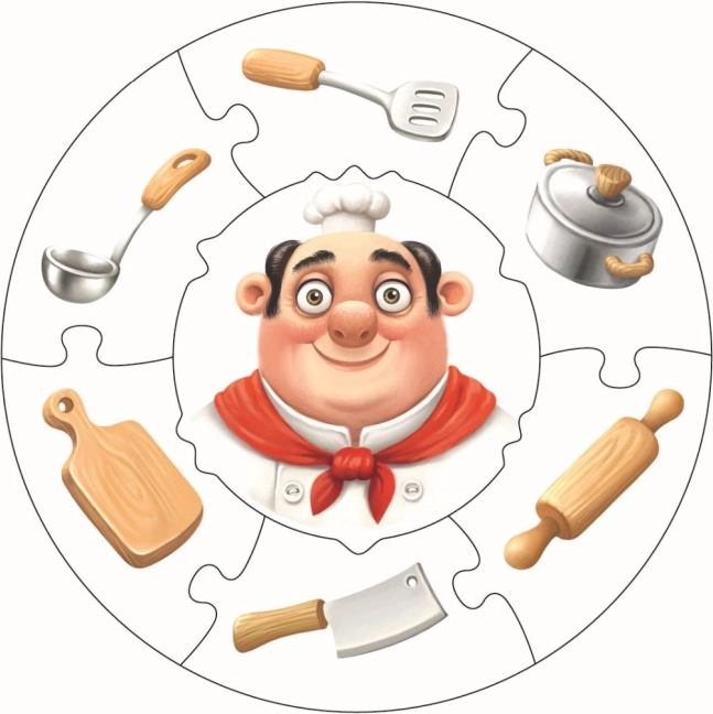 Ilustracija kuharja z orodjem (kuhalnica, lonec, valjar) pomaga razvijati logiko in spoznavanje vsakdanjih opravil.