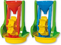 Ta otroški komplet za pesek je idealen za male graditelje gradov in ljubitelje vode ter peska. Zahvaljujoč odporno zasnovanim materialom zlahka prenese vsakodnevno uporabo na igrišču ali v vrtcu. Mlinček z enim lopatičnim kolesom poskrbi za zabavno sejanje peska ali prelivanje vode.