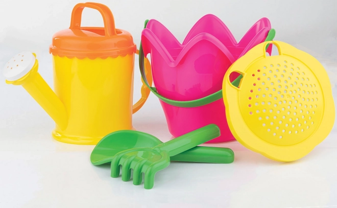 Ta 5-delni komplet za pesek znamke ANDRONI prinaša vse, kar otroci potrebujejo za ustvarjalno igro na plaži ali na igrišču. Vedro v obliki tulipana, zalivalka, sito, lopatka in grabljice spodbujajo razvoj motorike in domišljije. Plastika je izdelana v Italiji, je čvrsta, prožna in odporna proti pokanju pri običajni uporabi.