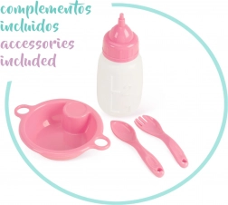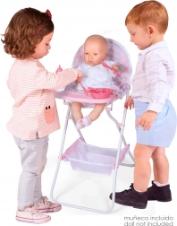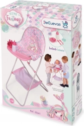 Del kompleta je jedilni pladenj z ljubkimi dodatki (steklenička, pribor) ter praktična shranjevalna košara v spodnjem delu. Mere 65 × 32 × 42 cm (v × š × g) in višina do pladnja 50 cm zagotavljajo udobno uporabo za otroke. Kakovostna izdelava znamke DeCuevas navduši z dolgo življenjsko dobo in varno zasnovo.