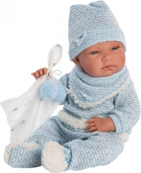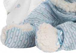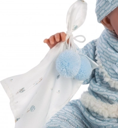 Poleg modne modre deke z ušesi, ki se ujema z njegovo obleko, je del opreme tudi dekorativna duda. Lutka je pakirana v privlačni darilni embalaži, ki posnema hišo znamke Llorens.