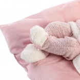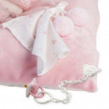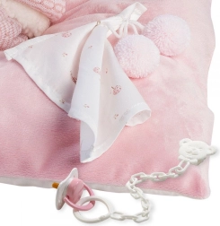 Vključuje dudico pritrjeno z belim verižico in mehko rožnato dekico za večjo igralno izkušnjo.