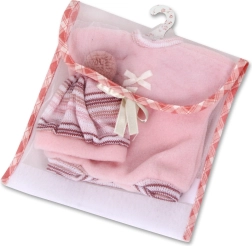 Podarite svoji punčki šarm in udobje s tem 3-delnim kompletom, namenjenim punčki velikosti 30 cm. Preprosto oblačenje in zapenjanje olajša vsakodnevno igro ter spodbuja otrokovo domišljijo in fino motoriko.
