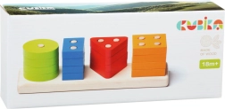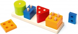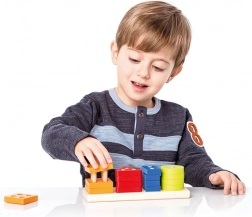 Ta kakovostna lesena sestavljanka ponuja 16 barvnih geometrijskih oblik, ki se natikajo na zatiče na pravokotni osnovi. Otroci se pri igri učijo prepoznavati barve in oblike, preizkušajo različne kombinacije ter naravno urijo koordinacijo in potrpežljivost.