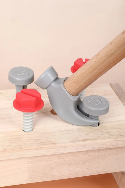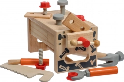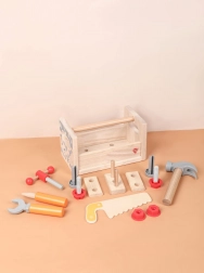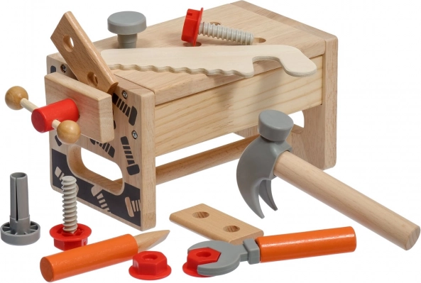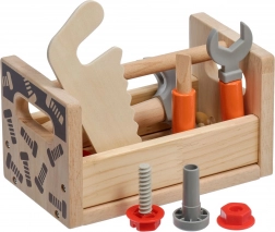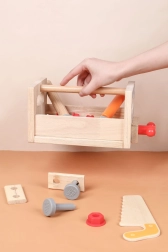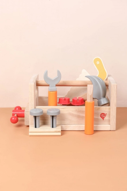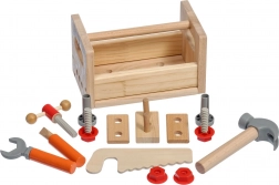 Del kompleta je raznoliko otroško orodje: kladivo, žagica, izvijač, ključ, vijaki in matice, primež ter gladki leseni delčki z luknjami. Vse ima svoje mesto, zato se otroci učijo reda in osnovnih tehnik dela s pritrdilnim materialom. Igra spodbuja ustvarjalno gradnjo, koordinacijo oko–roka in potrpežljivost.