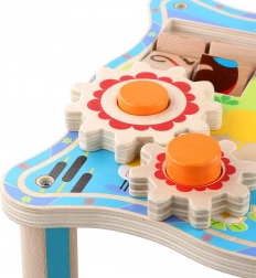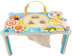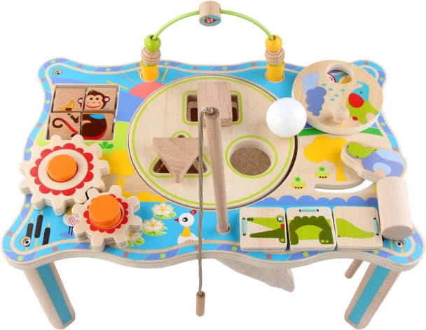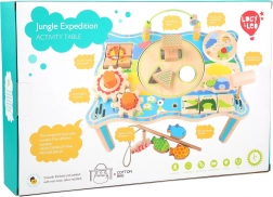 Lesena mizica z džungelskimi motivi združuje zabavo in učenje ter podpira fino motoriko, koordinacijo oko–roka in logično mišljenje. Otroci lahko vrtijo zobnike, premikajo kroglice po stezi, vadijo moč in zbranost s kladivcem ter urijo prepoznavanje oblik z vstavljanko. Na sredini je lanena vrečka za ulovljene ribice in igralne dele, ki ohranja igralno površino urejeno.