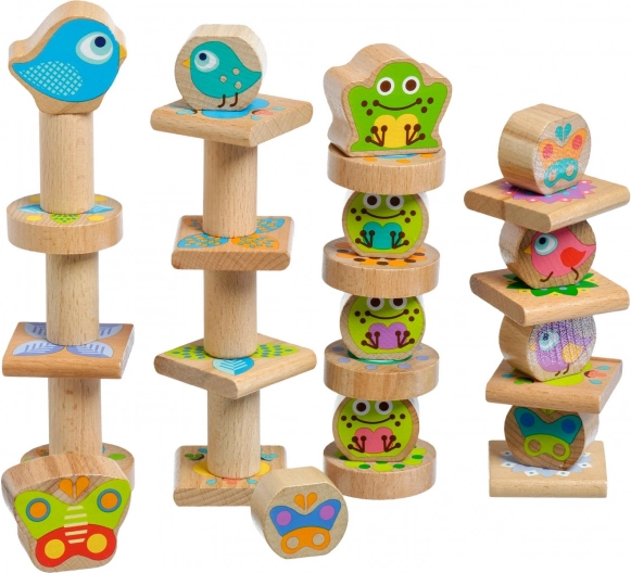 Odkrijte zabavno leseno balančno igro za otroke z motivi žabic, ptičkov in metuljev. Set vsebuje 33 delov in obojestranske karte s predlogami, ki razvijajo fino motoriko, koordinacijo oko–roka, potrpežljivost in kreativnost. Kakovostni leseni bloki z zaobljenimi robovi so varni za majhne otroške roke, shranite pa jih lahko v praktičen lanen vrečke za na pot.