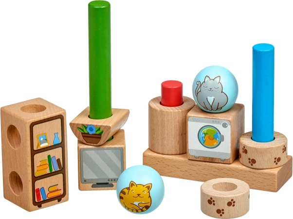 Vzdržljivi leseni liki z nežno brušeno površino ter ilustriranimi motivi mačk in predmetov. Idealno za majhne otroške roke.