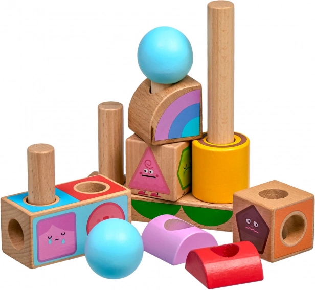 Lesena sestavljanka Oblike in čustva združuje igrivo učenje in zabavo. Otroci po karticah sestavljajo geometrijske oblike z veselimi obrazki na osnovo s količki, s čimer krepijo koordinacijske spretnosti, vizualno zaznavanje in logiko. Kakovostna lesena izdelava in žive barve spodbujajo pozornost in ustvarjalnost.