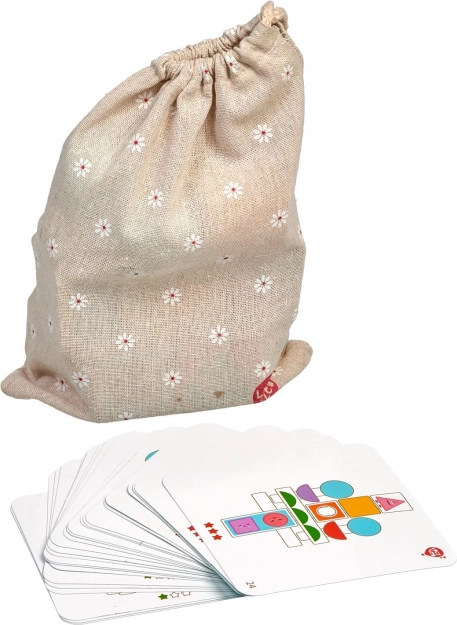 Komplet vsebuje 24 kartic z različno zahtevnostjo. Otroci urijo natančnost, načrtovanje korakov ter vizualno razločevanje oblik in barv.
