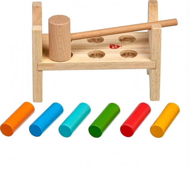 Šest barvnih zatičev in leseno kladivce učita otroke natančnega prijema, moči udarca in koordinacije oko–roka.