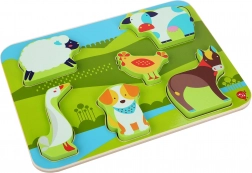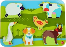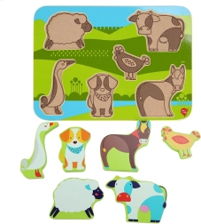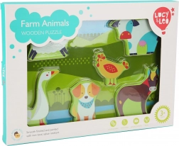 Lesene puzzle na temo kmetije bodo s svojimi živimi barvami in prijetno gladko površino razveselile deklice in dečke. Vsaka izmed 7 živali ima svojo natančno obliko, ki jo otrok zlahka vstavi v ustrezen izrez. Zaradi velikosti in debeline se kosi dobro primejo in so varni za samostojno igro.